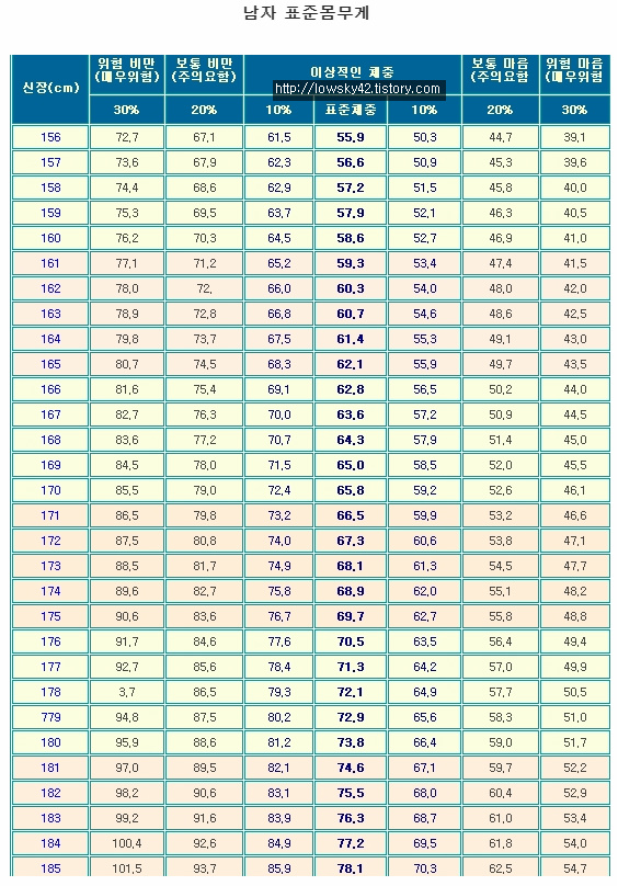 시중에 보시면 엄청나게 많은 정보들이 많아요. 사실 이런 정보가 어디 여기 뿐이겠어요? 저는 이 중에서 가장 후하게 계산해준 남자 표준 몸무게를 올려봅니다. 다시 말해서 표준이 상당히 높아서 좋아요.ㅎㅎ