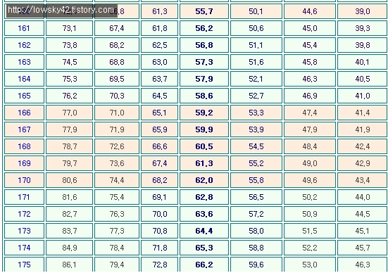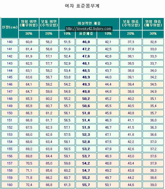 아까도 말씀드렸지만, 남자 표준 몸무게 올리는 김에 여자 정보도 같이 올려봅니다. 아무쪼록 해당하는 정보를 찾아보신 분들에게 약간의 도움이 되었으면 합니다.