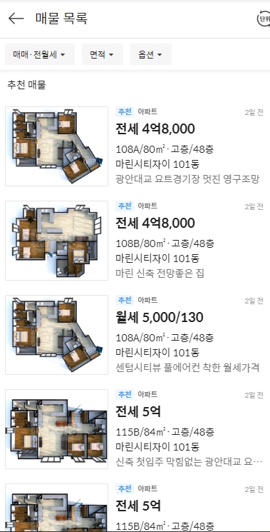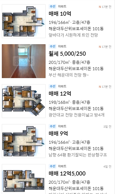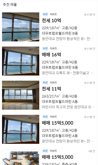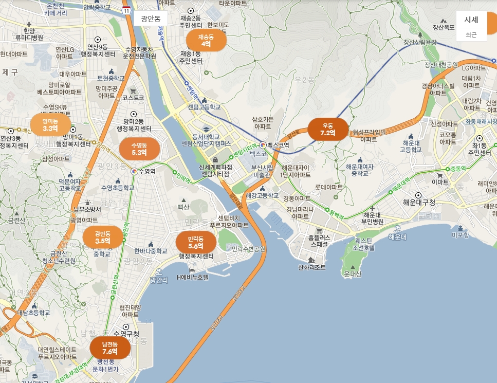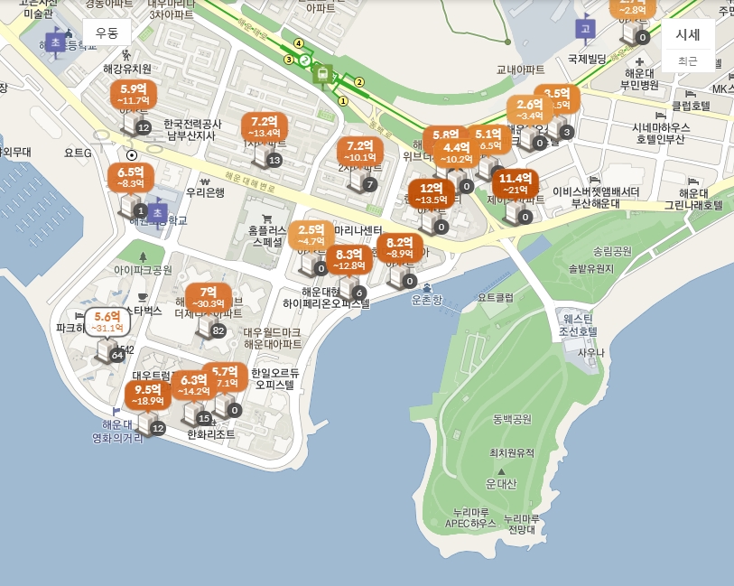 바다 보이는 아파트 시세를 알아봤습니다.