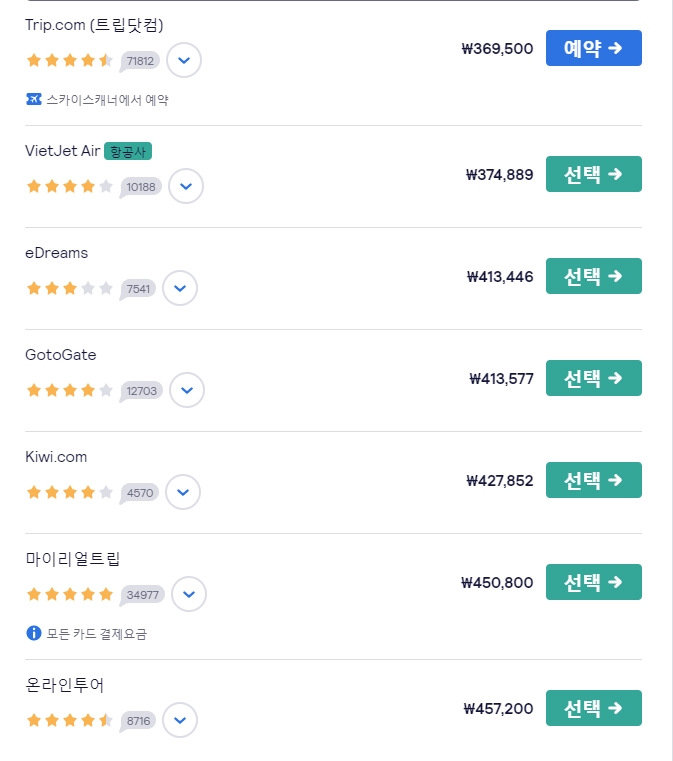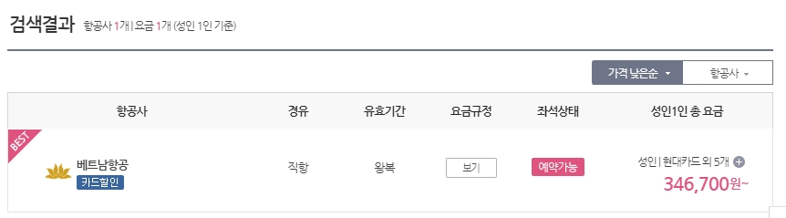 그래서 다시 찾아본 스카이스캐너라는 곳입니다. 요즘 이런 사이트때문에 여행사들이 장사가 안된다고 하던데, 저도 찾아보니 진짜 그럴만두. 다 검색해주니. 물론 저처럼 외국여행이 서툰 사람들은 그냥 패키지가 편할수도 있을것 같긴 하네요. 현재 검색해보니 최저가는 356,700 정도로 뜹니다. 항공사는 비엣젯이라고 하네요. 딱 느낌으로도 베트남 항공사 같죠??