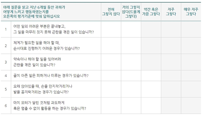 성인 ADHD의 진단을 위해 쉽게 사용할 수 있는 ‘성인 ADHD 자가보고척도(ASRS)' 가 있으며 선별 질문에서 검게 칠한 부분에 체크된 문항이 4개 이상이면 추가적인 검사가 필요합니다.